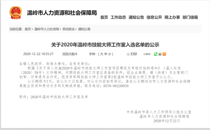 我司根據(jù)《關(guān)于深入實施2020年度溫嶺市技能大師工作室項目建設(shè)及考核評估的通知》(溫人社發(fā)〔2020〕59號)文件精神,通過自行推薦以及地方政府的大力支持,充分準備了相關(guān)申報資料,通過主管部門的初審以及專家的評審、部門審議和社會公示等評選環(huán)節(jié),我司最終順利通過評審,被評定為“李軍輝技能大師工作室”并于政府平臺公示。